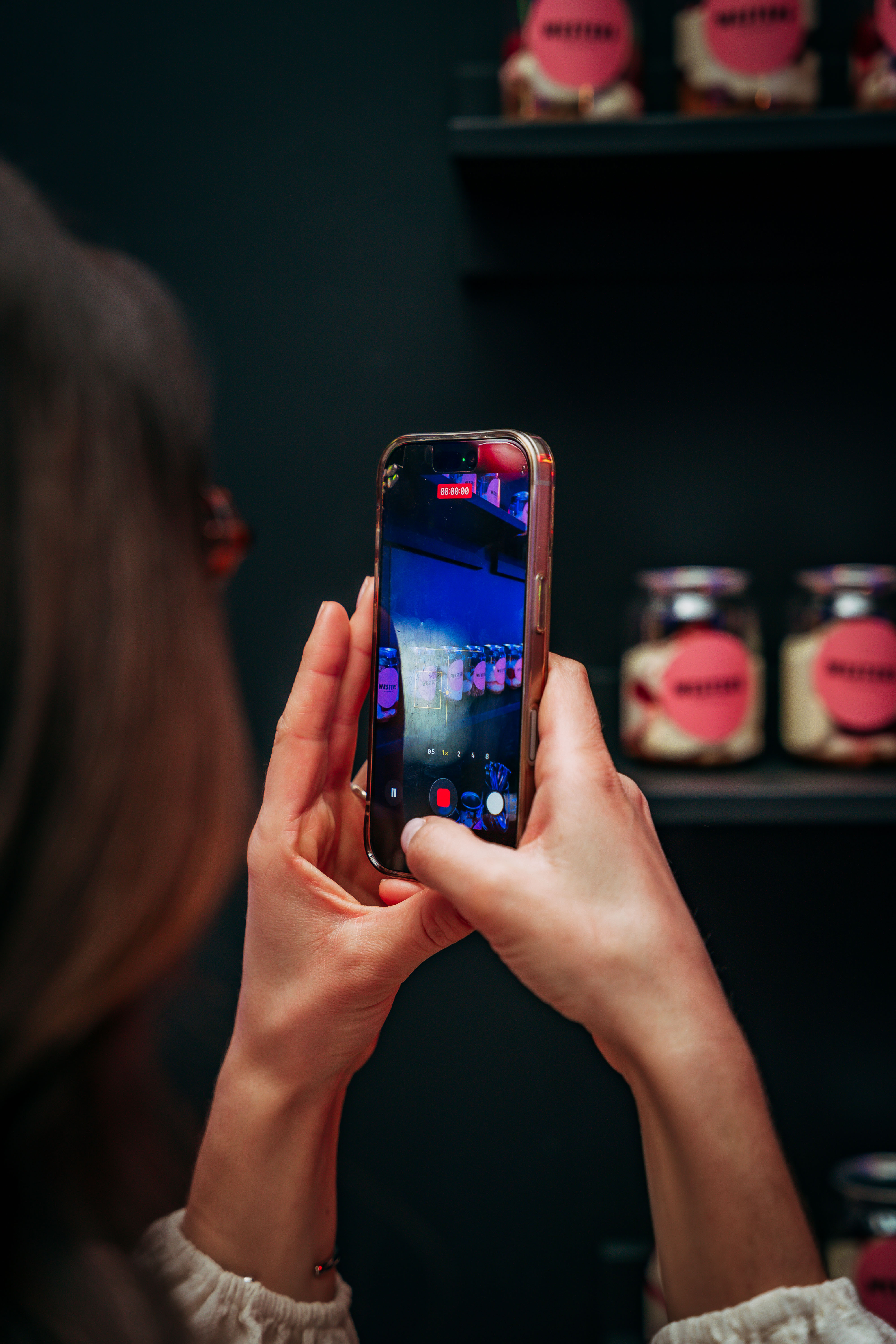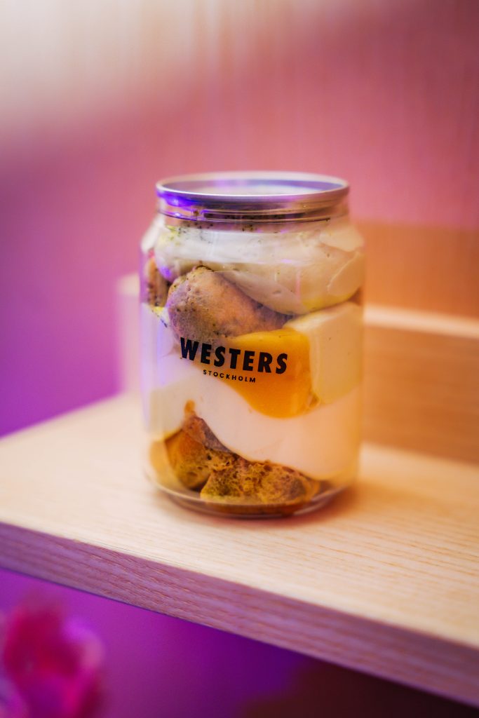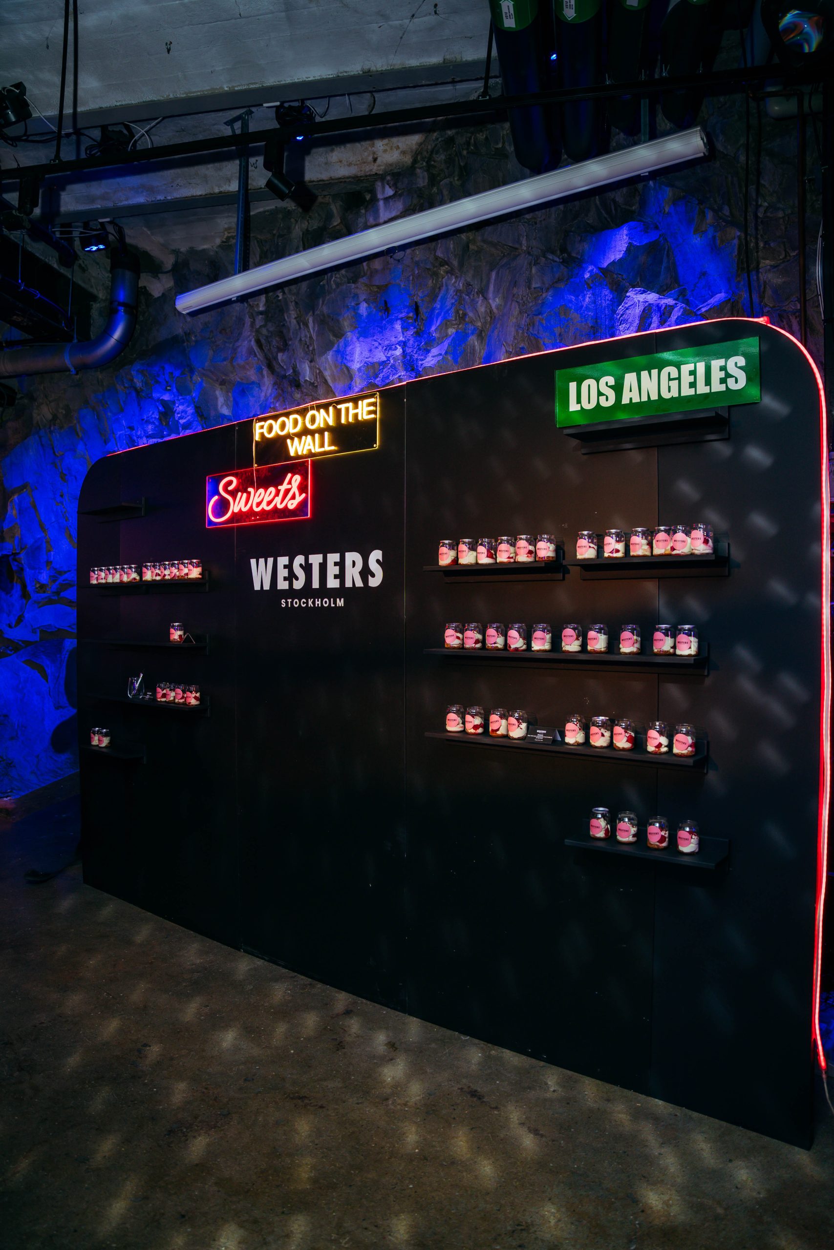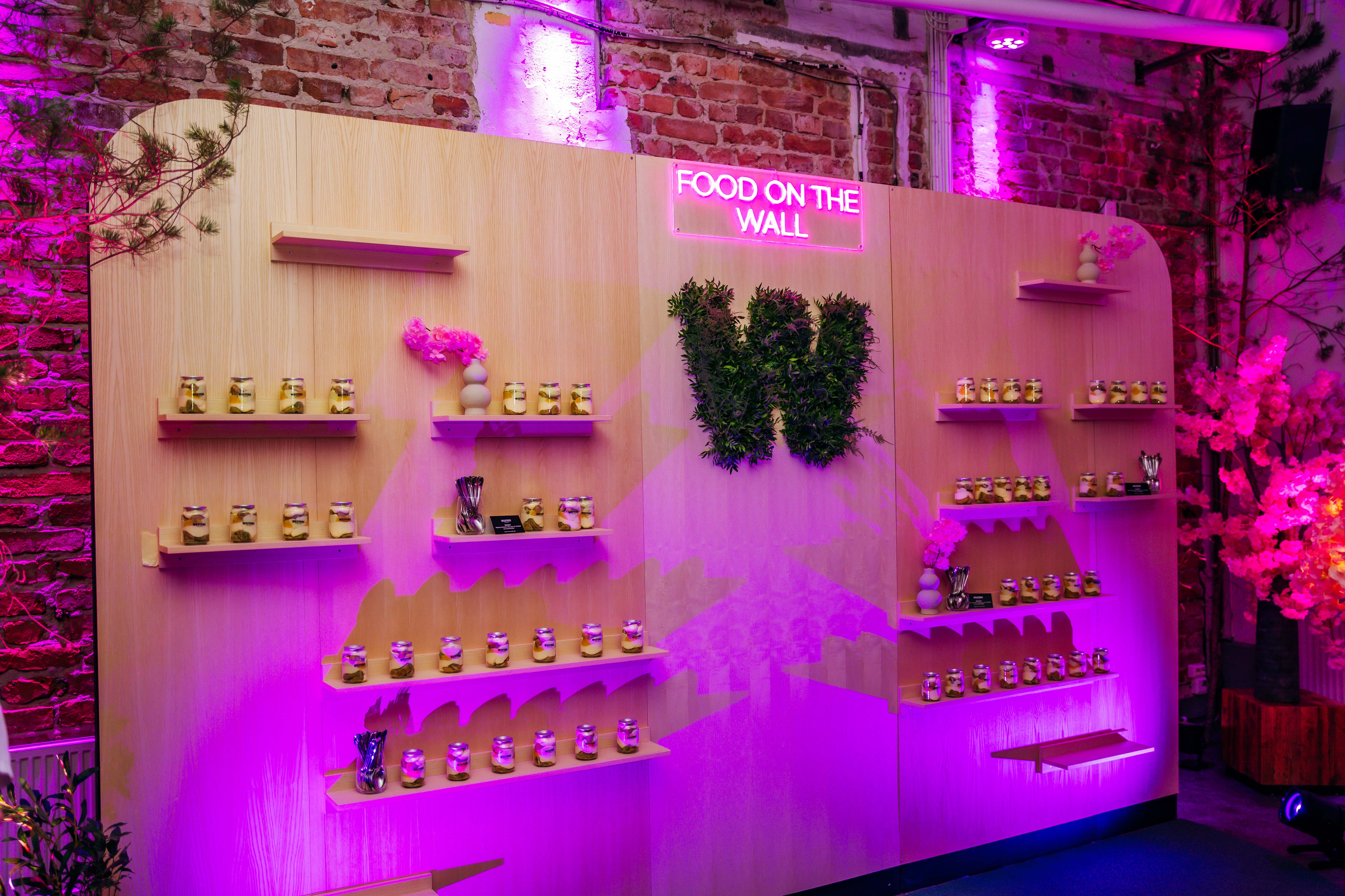 On a giant wall, desserts were served in soda cans โ one of the eventโs gastronomic novelties โ featuring NYC cheesecake with strawberries.