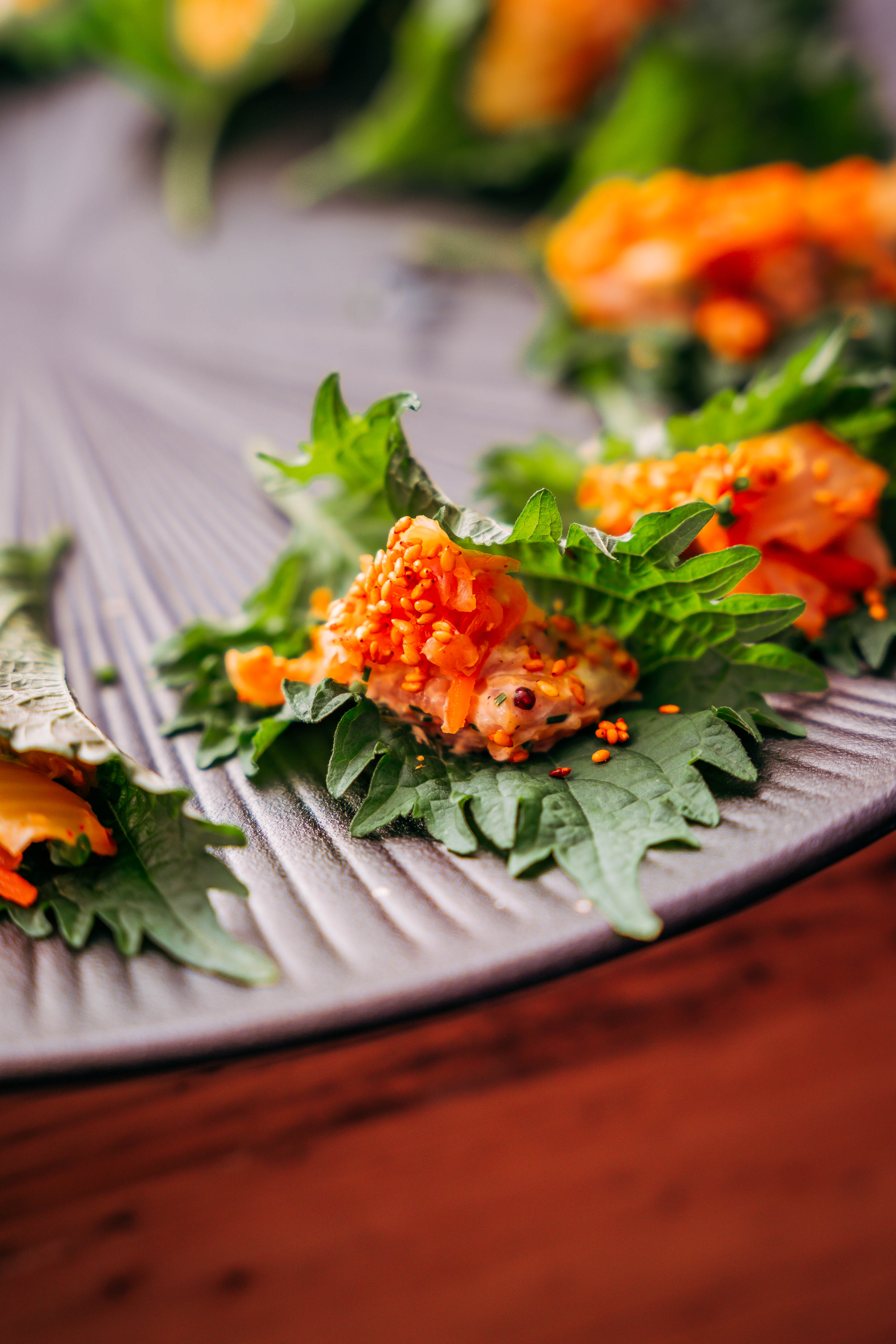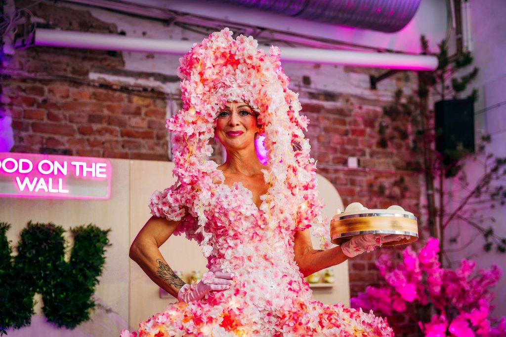 The evening featured entertainment throughout, including a street performer delivering singing and tap dancing followed by a mini flash mob, an aerial hoop acrobat in the Zen Room, and servers dressed as cherry blossom trees moving gracefully on stilts.