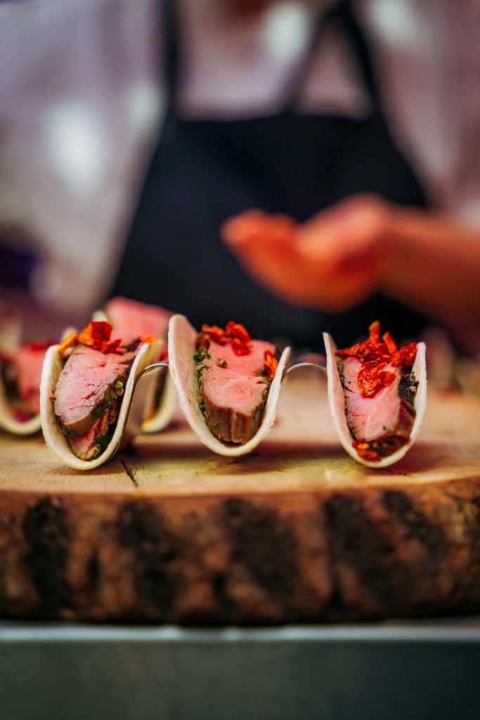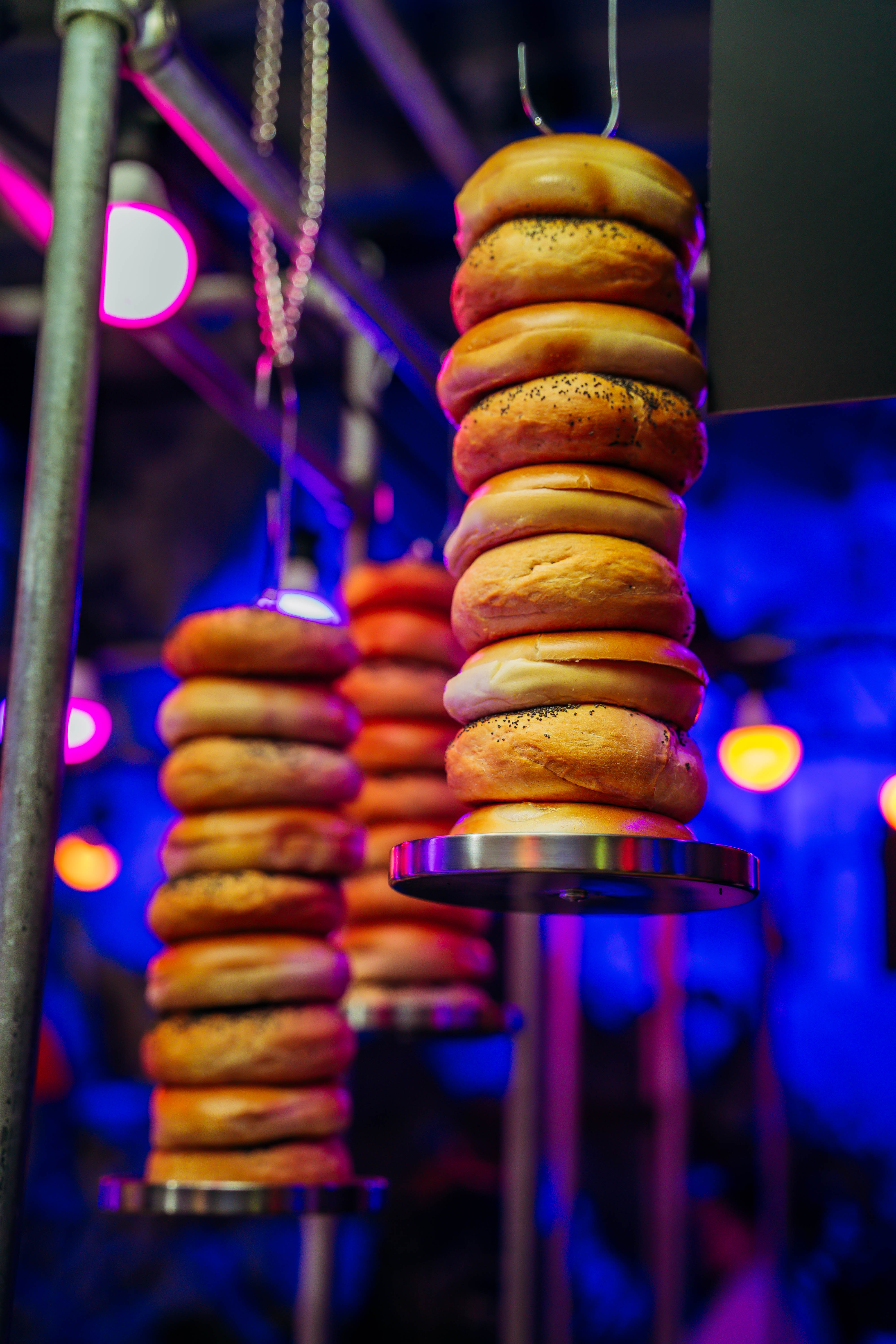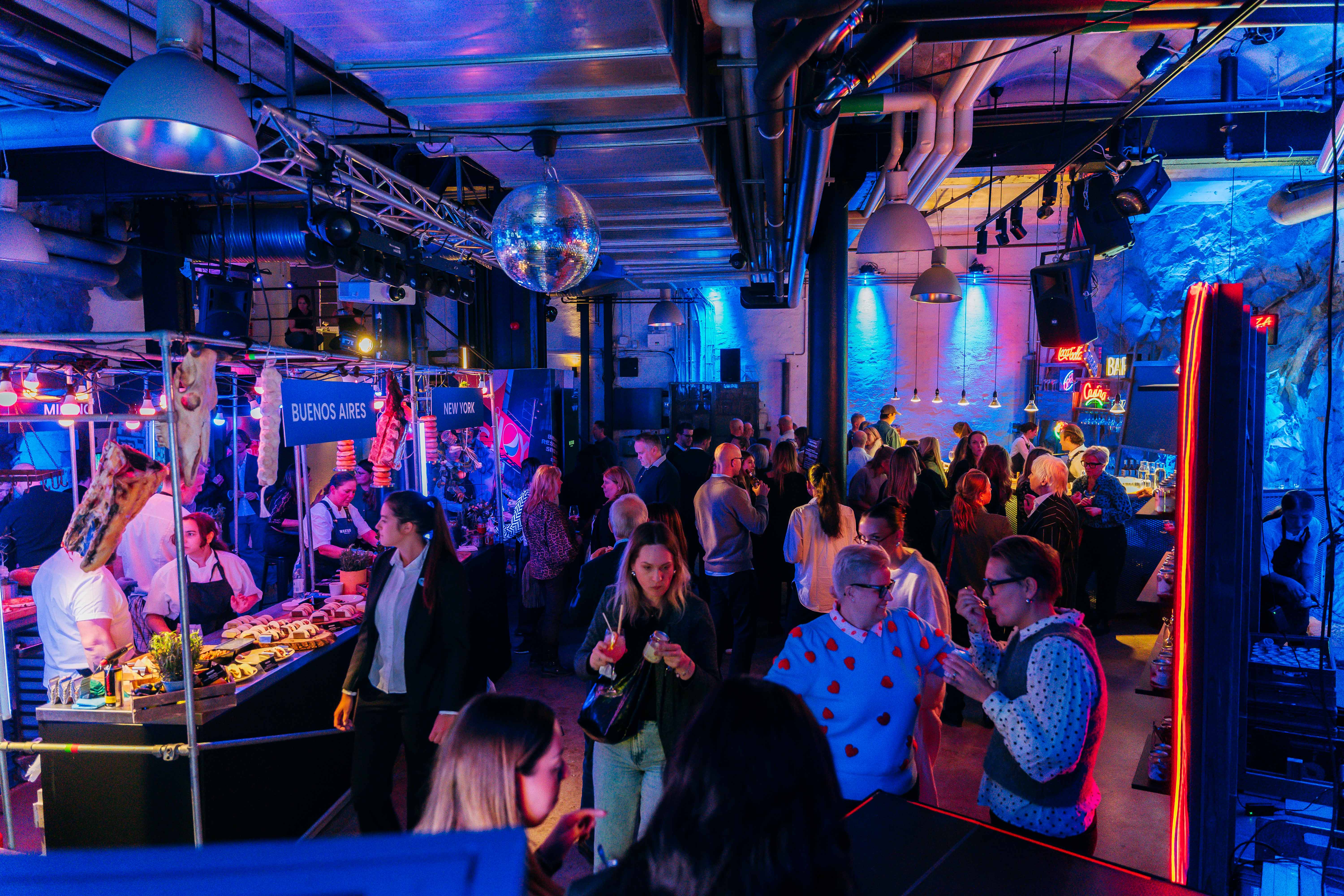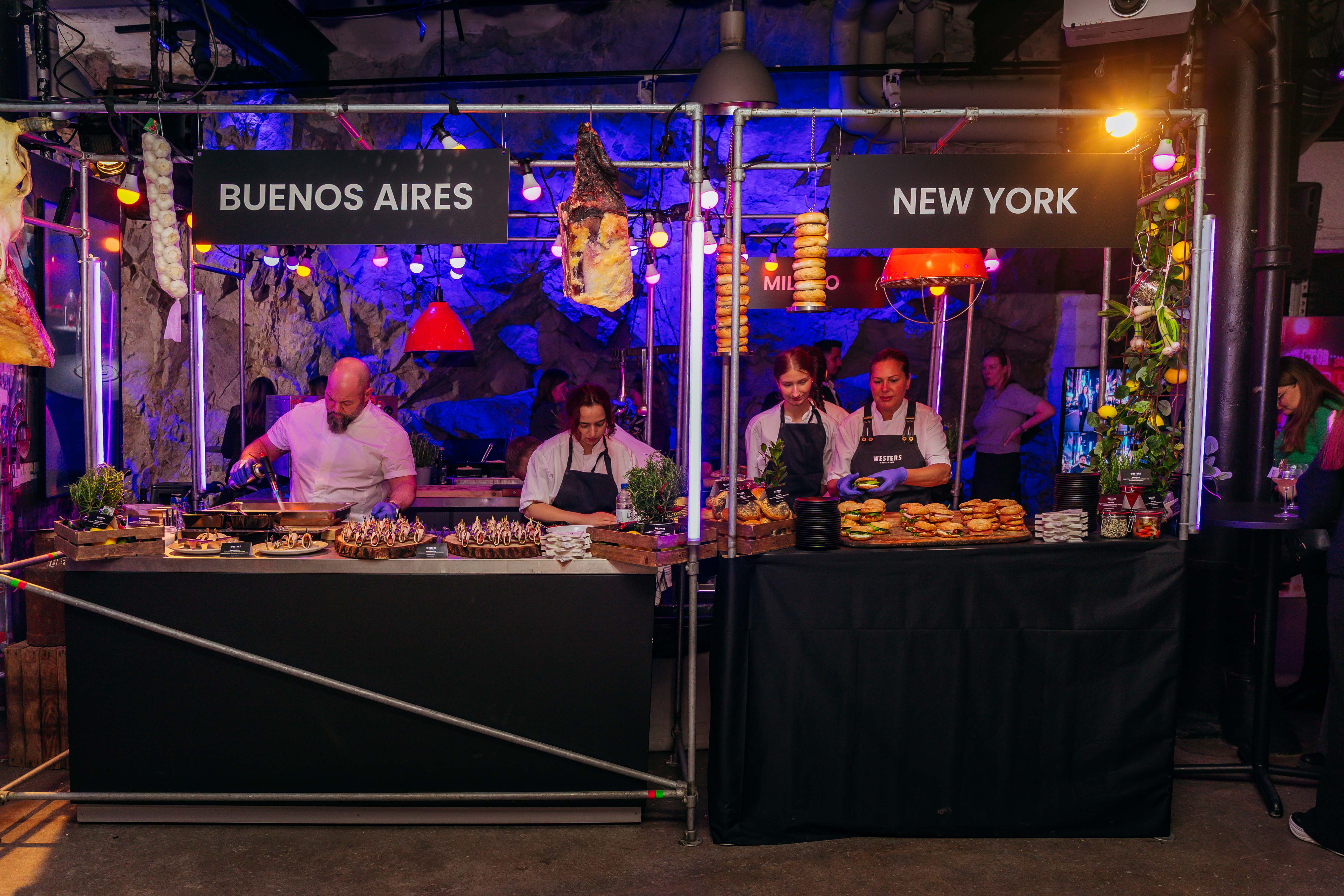 Once inside, guests stepped into an urban city environment filled with concrete, streets, city noise, and neon lights. Here, we built three different food stations around construction scaffolding, all styled with a metropolitan theme in both dรฉcor and service. Guests could enjoy bagels from New York, tacos from Buenos Aires, and flatbreads from Milan.