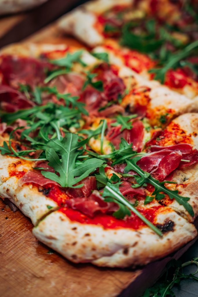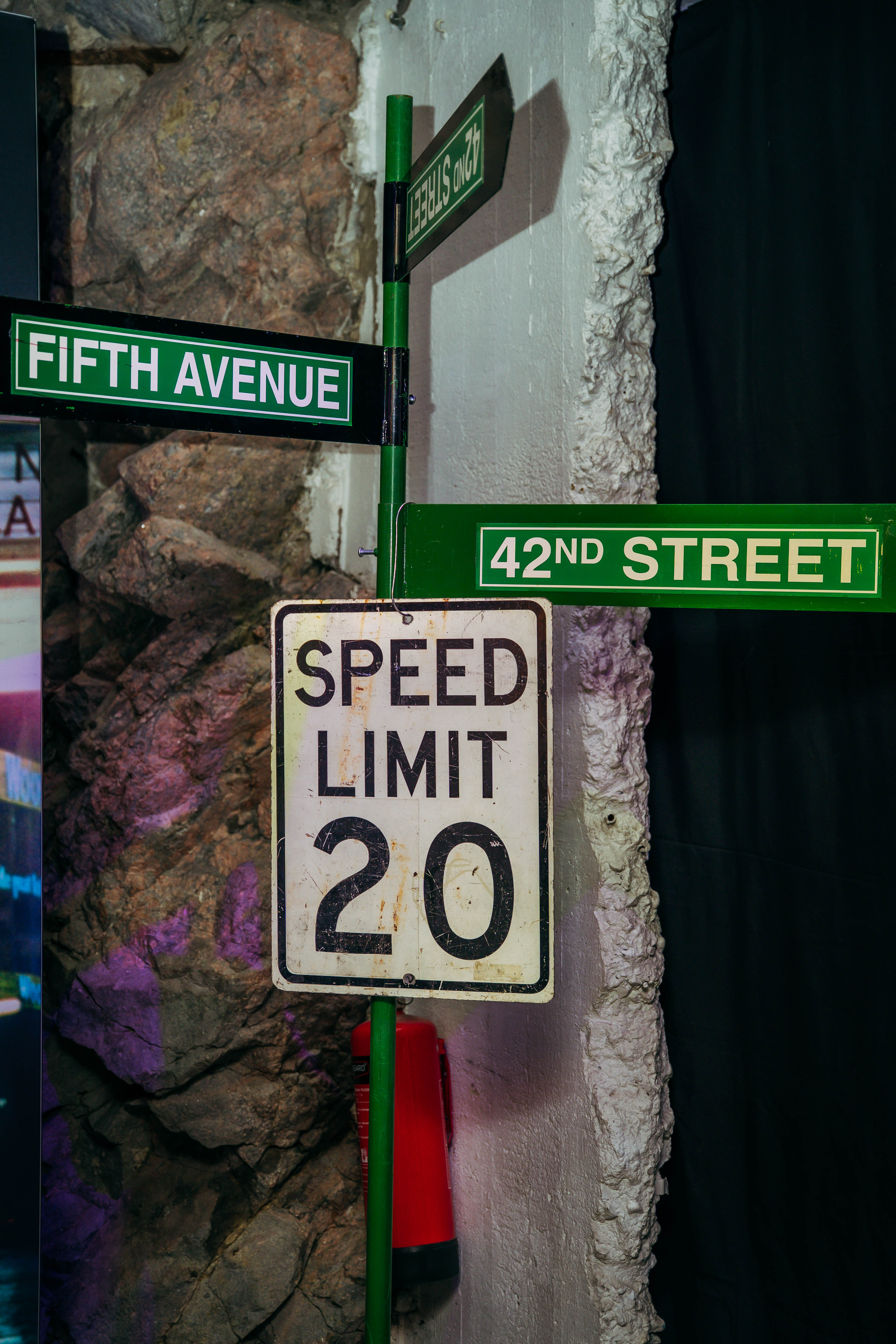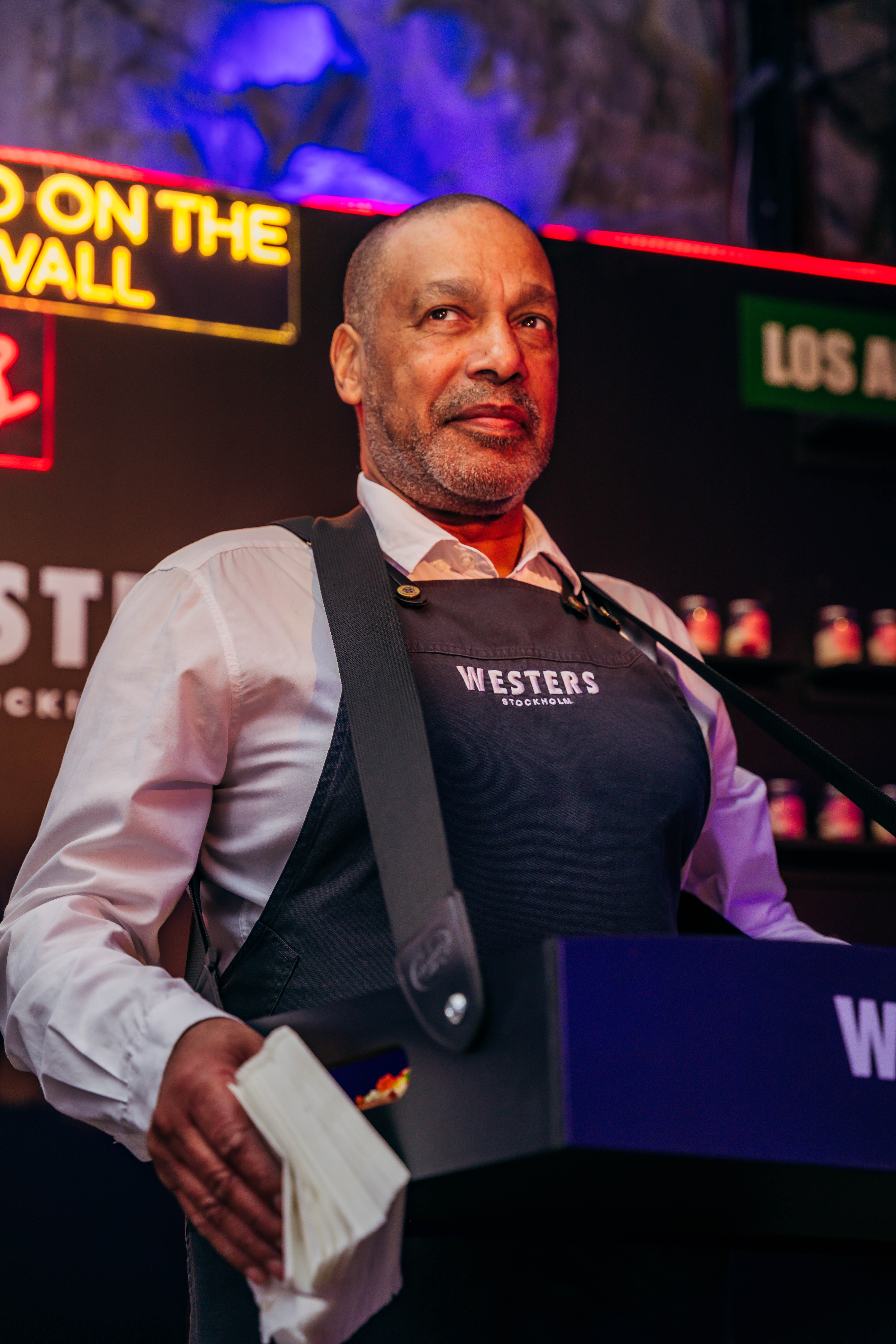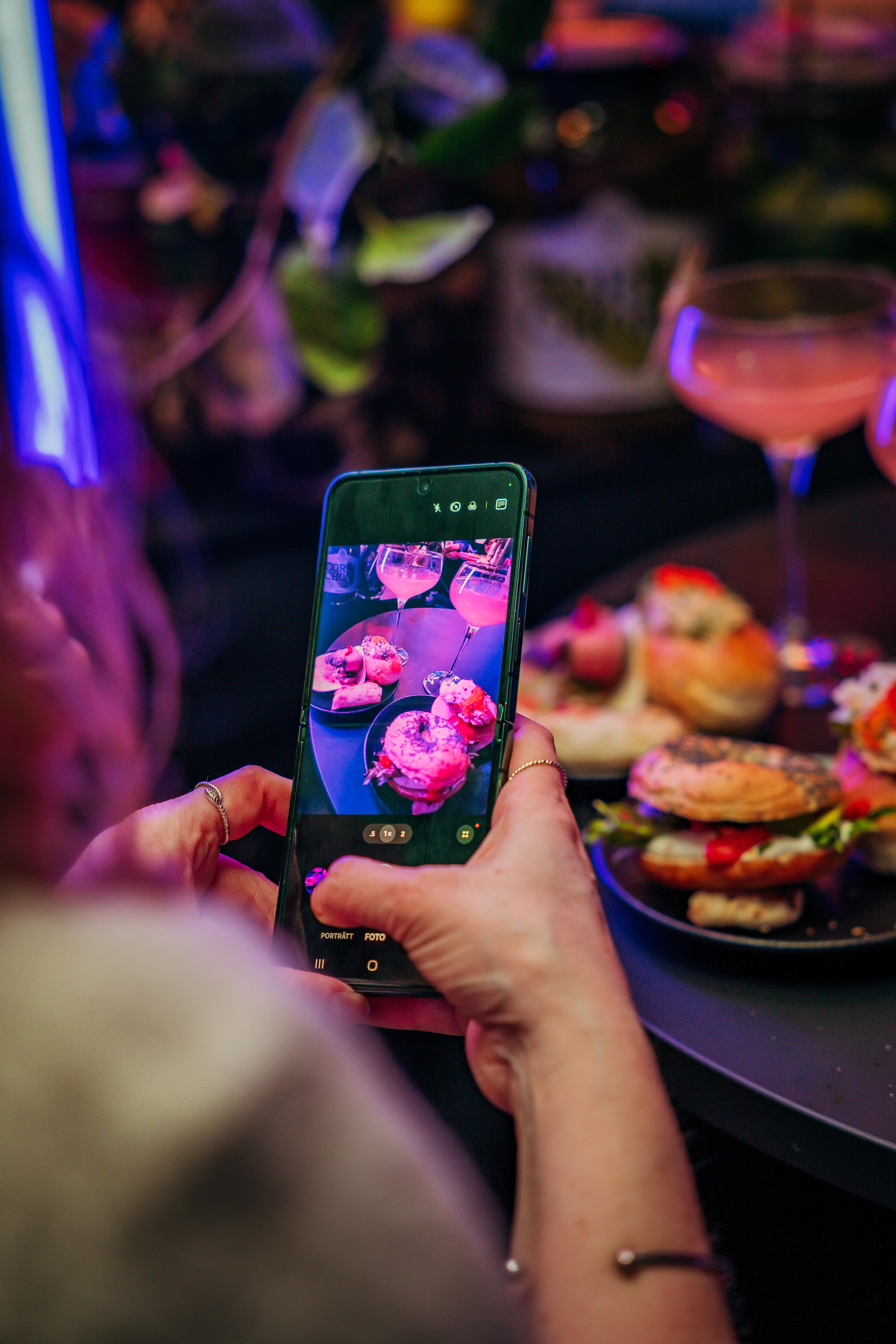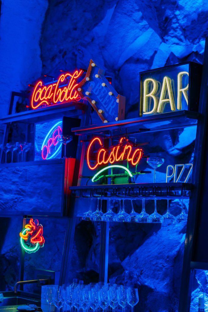 Once inside, guests stepped into an urban city environment filled with concrete, streets, city noise, and neon lights. Here, we built three different food stations around construction scaffolding, all styled with a metropolitan theme in both dรฉcor and service. Guests could enjoy bagels from New York, tacos from Buenos Aires, and flatbreads from Milan.